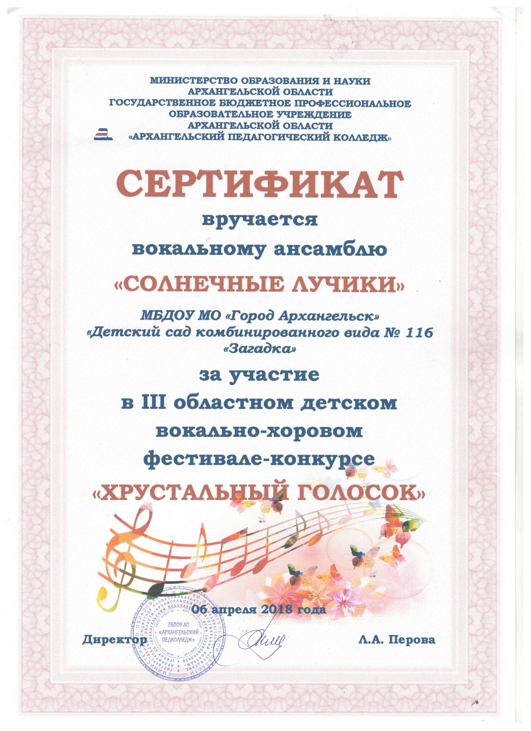 6 апреля в 10.00 на базе Архангельского педагогического колледжа состоялся детский вокально-хоровой фестиваль – конкурс «Хрустальный голосок». Цель Фестиваля – реализации творческого потенциала, выявлении и поддержки талантов, а также расширения круга интересов обучающихся дошкольных образовательных организаций, содействия в удовлетворении ими духовных, интеллектуальных, творческих и социальных потребностей, выявление талантливых детей в области вокального творчества, хорового пения. В фестивале приняли участие воспитанники дошкольных учреждений области : из городов Архангельска и Новодвинска. От нашего дошкольного учреждения выступал вокальный ансамбль «Солнечные Лучики» по руководством музыкального руководителя Антипиной Марии Андреевны с песнями «Калинка – Малинка» и «Пешком шагали мышки». Все участники фестиваля были сертификатами и памятными подарками.