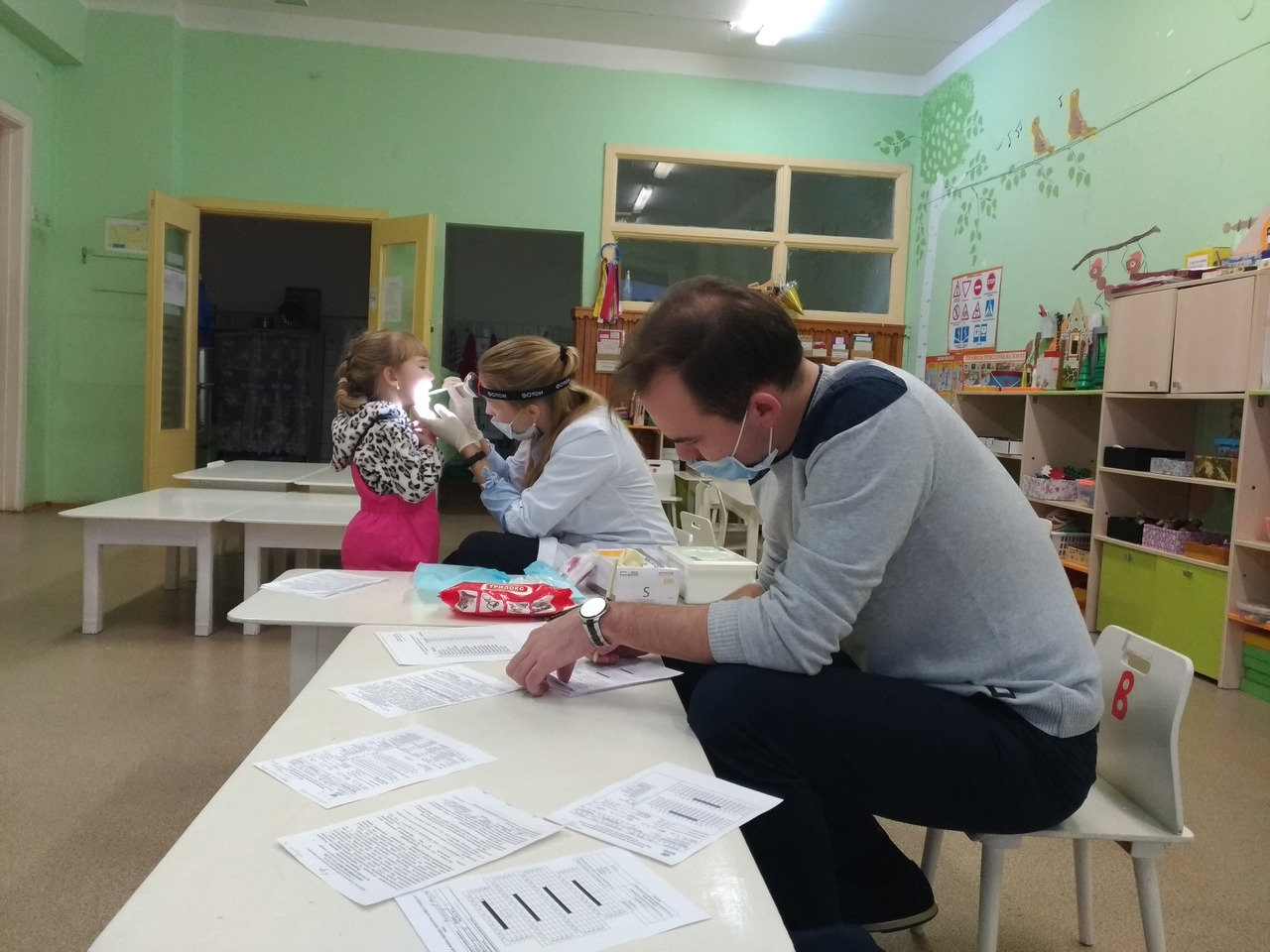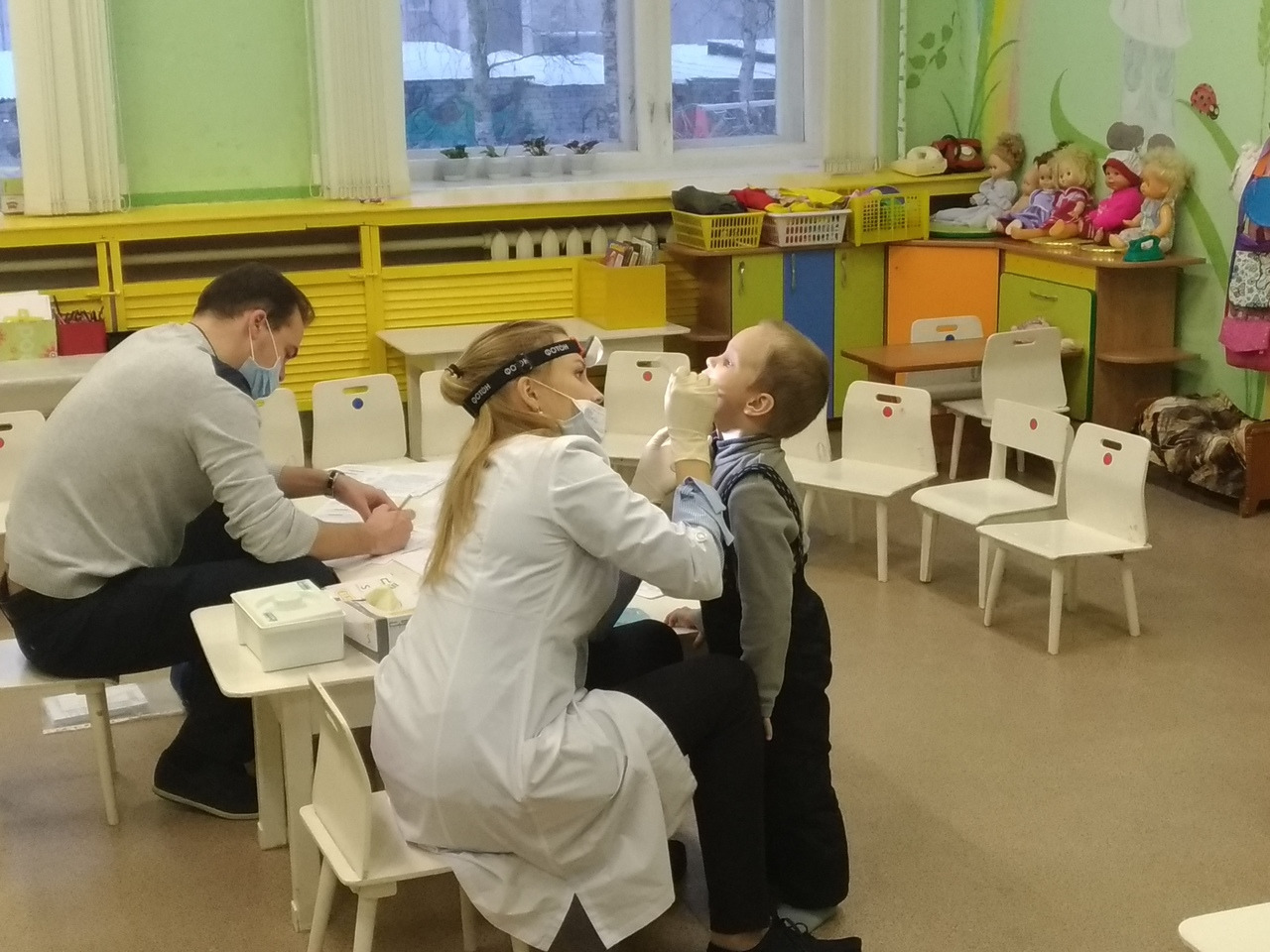 Сегодня в группах младшего дошкольного возраста был проведен профилактический осмотр зубов и ротовой полости воспитанников. В рамках распоряжения Министерства здравоохранения Архангельской области № 57 от 22 сентября 2017 года осмотр проводила детский врач-стоматолог, ассистент кафедры стоматологии детского возраста СГМУ, заведующая стоматологическим отделением КДП СГМУ Попова Дарья Александровна. Целью данного осмотра является профилактика и раннее выявление кариеса и других разрушительных процессов зубов. Родители воспитанников были проинформированы заранее и дали свое письменное согласие на осмотр. Родители, дети которых нуждаются в последующем лечении, были проконсультированы и отправлены за специализированной помощью.