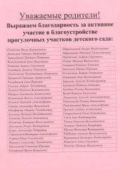 Администрация МБДОУ Детский сад № 116 выражает огромную благодарность родителям, принявшим активное участие в благоустройстве прогулочных участков детского сада. Целью данного проекта являлось создание эмоционально – благоприятных условий во время пребывания воспитаннников на прогулочных площадках на воздухе в теплое время года. Благоустройство окружающей территории способствует организации познавательной, творческой и оздоровительной деятельности детей.