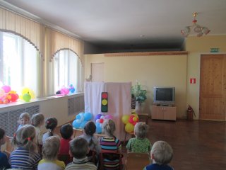 На кукольное представление «Правила дорожного движения» были приглашены воспитанники всех возрастных групп. Во время спектакля дети узнали как нужно вести себя на дороге, каким правилам нужно следовать при переходе по пешеходному переходу, и для чего нужен светофор.