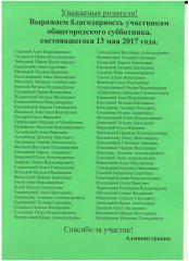 13 мая 2017 года в нашем дошкольном учреждении был организован субботник по уборке территории. Субботник - это прекрасный способ проявить наше желание жить в красивом мире, всем вместе пообщаться в неофициальной обстановке на открытом воздухе в весенний погожий денёк, ведь порядок должен быть как в человеке, так и вокруг него.Педагоги ДОУ и родители воспитанников приняли активное участие в этом полезном мероприятии. Ни в одной группе не оказалось равнодушных к чистоте и порядку людей. Как приятно, проведя уборку, смотреть на мир, который стал ещё красивее благодаря нашим стараниям.